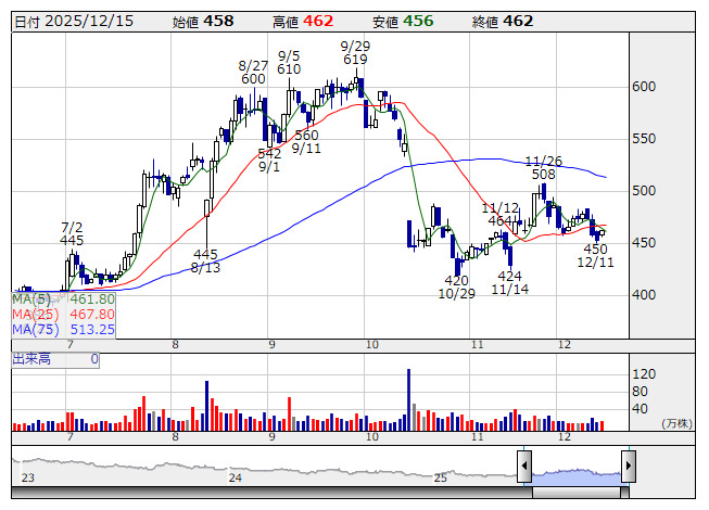 大幅続伸。先週末に25年10月期の決算を発表、営業利益は116億円で前期比7.1%増となり、従来計画の120億円を小幅に下回った。一方、26年10月期は140億円、同20.4%増の見通しとしており、135億円程度の市場コンセンサスをやや上回っている。トルコの損益改善や海外旅行の回復など、下期にかけての収益拡大を想定しているようだ。ここまで株価低迷が続いていたため、大幅増益ガイダンスに買い安心感が先行。
