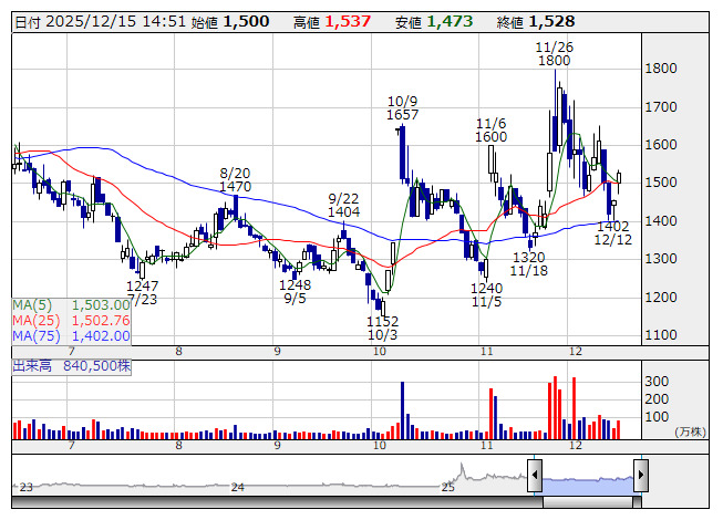 5243>が急動意、朝方に前日比83円高の1537円まで買われ、その後も売り物をこなし高値近辺で頑強な値動きを示している。クリエイターがコンテンツを投稿・販売するCtoCプラットフォームの運営を主力業務とし、会員登録数は1050万人を上回り、公開コンテンツは6400万件を超えるなど、クリエイタープラットフォームとして国内トップクラス。また、個人向け以外に法人向けプラットフォームでも需要獲得が進んでいる。米グーグルの最新AIモデルである「Gemini(ジェミニ)3」が世界的に脚光を浴びるなか、同社はグーグルとの資本・業務提携関係にあり、関連最右翼として投資マネーの食指を動かしている。