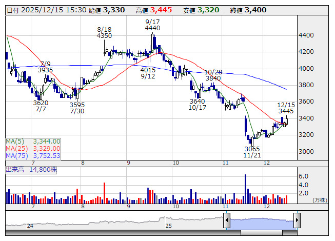 Dサイクル <日足> 「株探」多機能チャートより14店舗の出店と2店舗の直営化で店舗数が16店舗増となったことに加えて、電動アシスト車販売の好調で売上高が第3四半期累計として過去最高を更新した。出店を加速させたことにより出店関連費用は増加したものの、一方で修理の増加なども寄与し営業利益も第3四半期累計として過去最高となった。