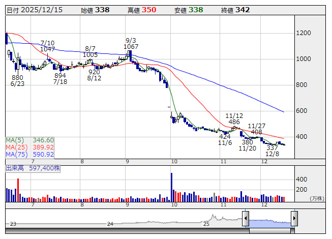 ミガロHD <日足> 「株探」多機能チャートより12月15日に、株主優待制度について発表した銘柄を取り上げた。