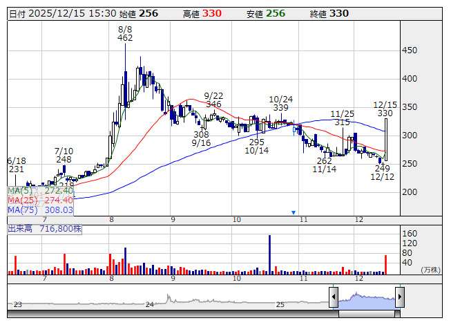 地域新聞社 <日足> 「株探」多機能チャートより■地域新聞社 <2164> 330円 (+80円、+32.0%) ストップ高