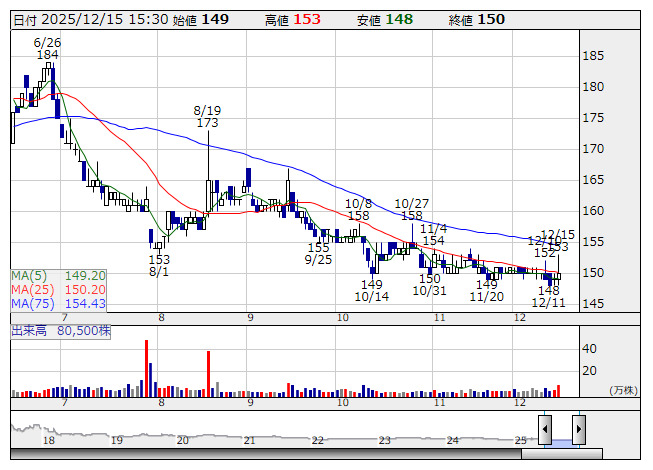 2025年12月16日05時45分 【注目】本日注視すべき【CB発行】銘柄 (15日大引け後 発表分) クロスフォー <日足> 「株探」多機能チャートより 〇クロスフォー <7810> [東証S] 7億円の新株予約権付社債(転換社債=CB)を発行する。転換価格は140円で、全額をグロースパートナーズに割り当てる。 [2025年12月16日] 株探ニュース