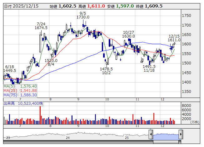 直近のリバウンドで75日線を上抜けており、10月27日の戻り高値(1630円)が射程に入っている。戻り高値を明確に上抜けてくるようだと、9月5日につけた1730円がターゲットになりそうだ。一目均衡表では前日の上昇で一目均衡表の雲上限を突破し、遅行スパンは上方シグナルを発生させている。週足では雲を上回っての推移を続けており、遅行スパンは上方シグナルを継続。