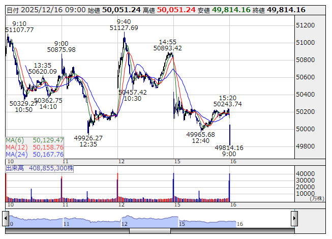 日経平均 <5分足> 「株探」多機能チャートより前日の欧州株市場は総じて堅調な値動きを示したが、米国株市場では依然としてハイテク株への売り圧力が拭えず、ナスダック総合株価指数が下げ止まらない状況となっている。東京市場でも主力ハイテク株への買いが手控えられる状況下で日経平均の上値も重く、目先は5万円大台攻防の展開が想定される。ただ、中小型株への物色意欲は活発で市場センチメントの悪化は限定的なものにとどまりそうだ。取引時間中は米株価指数先物の値動きなどにも影響を受ける可能性がある。