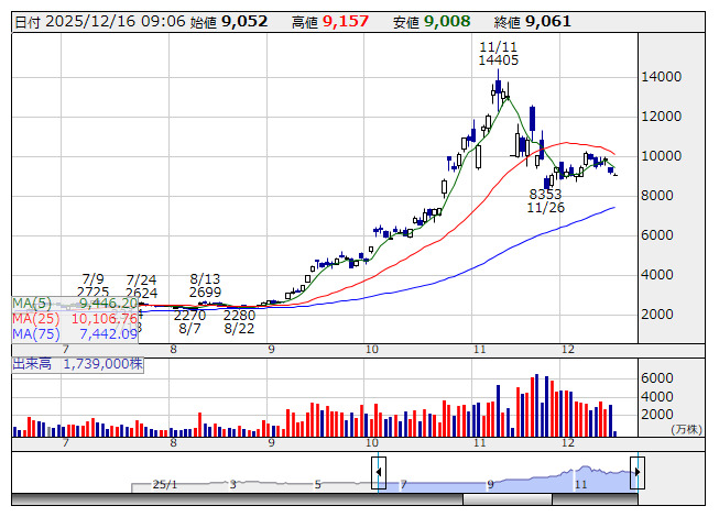 キオクシア <日足> 「株探」多機能チャートより本日取引開始後、特別気配を2回引き上げた9時6分現在の約定回数ランキング上位50社を取り上げた。常に約定回数が多い主力大型株に混じり、買い材料の現出などでランクインする新興市場の中小型株が注目される。
