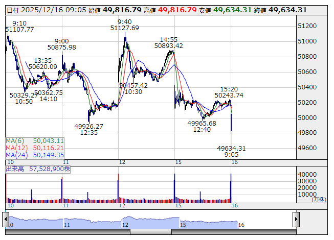 2025年12月16日09時10分 【市況】日経平均の下げ幅が500円を超える 日経平均 <5分足> 「株探」多機能チャートより 日経平均株価の下げ幅が500円を超えた。9時9分現在、504.25円安の4万9663.86円まで下落している。 株探ニュース