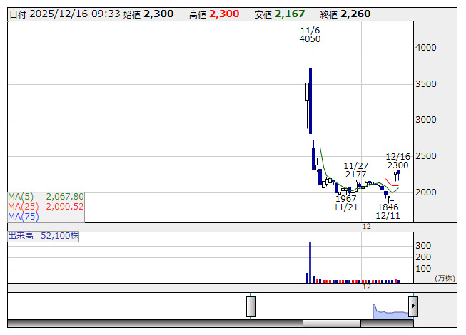 反落。25年10月期売上高は36.31億円(前年同期比17.7%増)、経常利益は1.38億円(同154.0%増)と大幅増収増益だった。26年10月期見通しも、売上高42.50億円(前期比17.0%増)、経常利益2.14億円(同54.7%増)と2桁増収増益を見込む。国内ではエントリー商品の積極投下、新規顧客層の拡大を目的として国内向け公式オンラインストアに加えて他社モールに出店し売上の更なる成長を図り、海外展開も加速させる。ただ、地合いの悪さに押され、売りが優勢となっている。