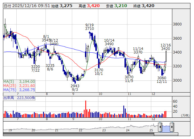 2025年12月16日09時50分 【材料】ギフトHDは3日続伸、26年10月期営業益予想28%増で4円増配へ ギフトHD <日足> 「株探」多機能チャートより ギフトホールディングス<9279>が3日続伸となっている。同社は15日取引終了後、26年10月期通期の連結業績予想を公表。営業利益の見通しを前期比27.7%増の43億円としていることや、年間配当計画を前期比4円増配の26円(中間配13円、期末配13円)としていることが好感されているようだ。 売上高は同19.9%増の430億円を見込む。国内では既存事業の拡大や新業態の開発・展開を推し進め、海外では中期的な店舗数拡大を見据えた体制構築に取り組むとしている。 出所:MINKABU PRESS