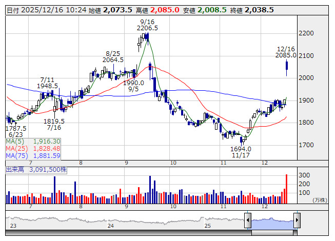 2025年12月16日10時24分 【材料】パーク24---大幅続伸、好業績見通しや大幅増配計画を好感 パーク24 <日足> 「株探」多機能チャートより パーク24<4666>は大幅続伸。前日に25年10月期の決算を発表、営業利益は376億円で前期比2.9%減となり、従来予想の390億円を下振れる着地に。一方、26年10月期は415億円で同10.5%増の見通しとしており、コンセンサスも小幅に上回る水準とみられる。また、劣後ローン返済が決まるなど財務イベントをクリアできる見通しになったことで、年間配当金は前期比35円増の65円を計画するなど、大幅増配を予定している。 《HM》 提供:フィスコ
