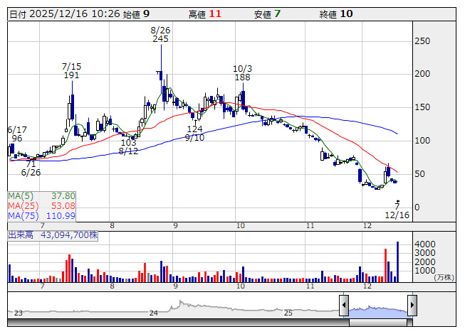 2025年12月16日10時25分 【材料】ピクセルは急落、東証が上場廃止を決定 ピクセル <日足> 「株探」多機能チャートより ピクセルカンパニーズ<2743>は急落。ストップ安水準となる前日比30円安の7円をつけた。東京証券取引所が15日、同社株の上場廃止を決定したと発表した。内部管理体制確認書の提出前で、内部管理体制などが適切に整備・運用される見込みがなくなったと認められたため。12月15日から来年1月15日まで整理銘柄に指定された後、来年1月16日付で上場廃止となる。これを受けて処分売りが出ている。 出所:MINKABU PRESS
