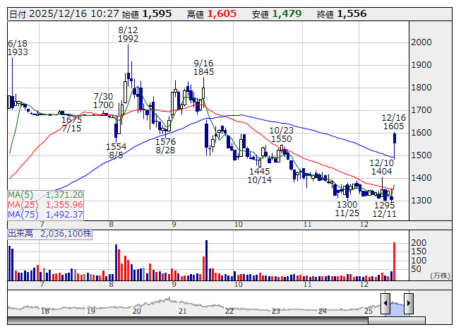 アセンテック <日足> 「株探」多機能チャートよりアセンテック<3565>は15日、2026年1月期第3四半期累計の好調な業績を受け、通期業績予想を上方修正したと発表した。