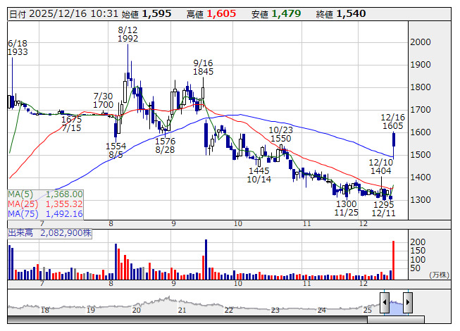 アセンテック <日足> 「株探」多機能チャートよりアセンテック<3565>は15日、2026年1月期(2025年2月1日-2026年1月31日)の通期連結業績予想および配当予想の修正を発表した。