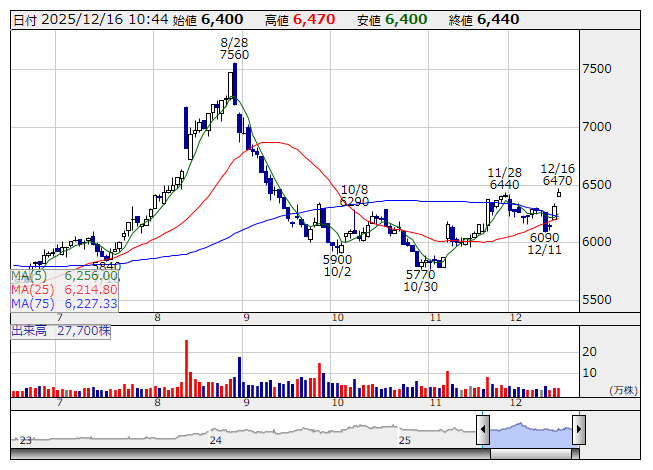 2025年12月16日10時55分 【材料】松屋フーズが3日続伸、「六厘舎」を展開する松富士を買収 松屋フーズ <日足> 「株探」多機能チャートより 松屋フーズホールディングス<9887>が3日続伸している。15日の取引終了後、関東を中心に「六厘舎」をはじめとするラーメンチェーンを展開する松富士(東京都千代田区)の全株式を26年1月5日付で取得し子会社化すると発表しており、好材料視されている。 ラーメン業態への本格進出を通じて顧客接点を拡げ、事業の持続的成長と収益性の一層の向上を目指す。取得価額は91億6000万円。なお、業績への影響は精査中としている。 出所:MINKABU PRESS