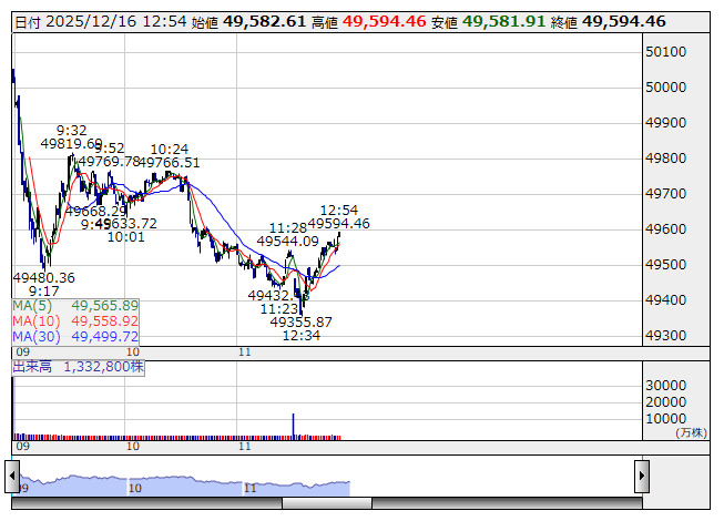 米株式市場の動向を横目に、16日の日経平均は116.87円安の50051.24円と続落して取引を開始した。その後、寄付き直後は売り圧力が先行したものの、ドル円相場が円安水準で推移となる中、輸出関連株など一部の買い戻しが見られた。市場では米国の重要経済指標発表を控え、手控えムードが午前の取引全般に影響し、明確な方向感のない展開となった。また、出来高は前日比でやや低調な推移となり、参加者の積極的な取引姿勢に慎重さが見られた。