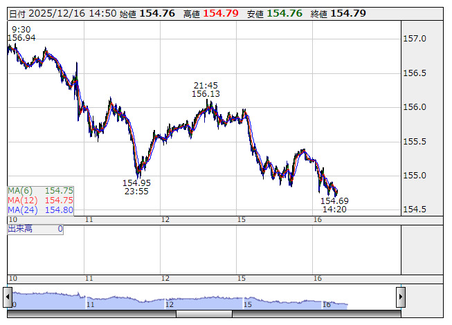 米ドル/円 <5分足> 「株探」多機能チャートより16日午後の東京市場でドル・円はじり安となり、一時154円68銭まで下値を切り下げた。日経平均株価は前日比700円超安と下げ幅を拡大し、円買い地合いに振れやすい。上海総合指数と香港ハンセン指数、米ダウ先物も大きく下げ、円買いを後押しする。
