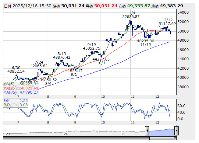 日経平均 <日足> Fastストキャス 「株探」多機能チャートより16日の日経平均は続落。終値784.82円安と昨日668.44円安に続く大幅安で、下降中の25日移動平均線(50023.48円)や節目の5万円を下回った。25日線上方から下向きの5日線が迫っており、明日17日以降のデッドクロス完成による弱気形状出現が警戒される。一目均衡表では、終値が雲下限を下回っており、地合いは「強気」から「中立」に移行しつつあるようだ。
