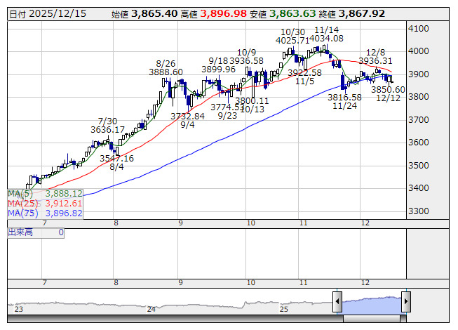 上海総合指数は約3カ月ぶりの安値水準まで切り下げている。景気鈍化への警戒感を背景に売り圧力が強まった。主要国株式市場でハイテク関連の地合いが悪化するなか、中国本土株にも売りが波及した。銀行・酒類など時価総額の大きいセクターに下落が目立ち、需給の重さが鮮明となった。他方で一部資源や景気敏感セクターに押し目買いの動きがみられたが、市場心理は総じて慎重だった。