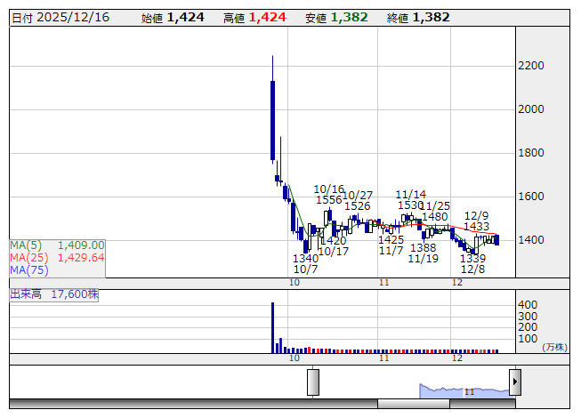 GMOコマス <日足> 「株探」多機能チャートより12月16日引け後に、株主優待制度について発表した銘柄を取り上げた。