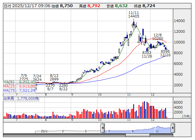 6. <5721> Sサイエンス 東証S 2,767 217 ( -2.3 ) 仮想通貨関連