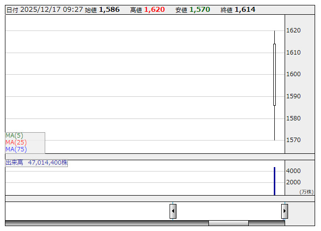 2025年12月17日09時28分 【材料】【IPO】SBI新生銀行<8303>---初値は1586円(公開価格1450円) SBI新生銀 <日足> 「株探」多機能チャートより SBI新生銀行<8303>の初値は公開価格を9.4%上回る1586円となった。初値形成時の出来高は2464万300株だった。 《CN》 提供:フィスコ