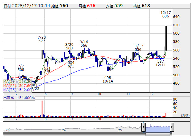 5906>が急動意。大陽線でもみ合いを上放れ、7月末につけた年初来高値577円を払拭、約4カ月半ぶりに新値街道に突入した。一時86円高の636円まで駆け上がる場面があった。ガソリンスタンド向け洗車機や道路情報表示装置、低温貯蔵庫などメカトロ技術を駆使した商品を手掛ける。持ち前の技術力を横軸展開し、食品用充填機と協働ロボットをパッケージ化した製品の開発に成功、職人技レベルの繊細な作業を自動的に行うことを可能とした。26年3月期は2ケタ減益予想にあるが、株価的には織り込み済みで27年3月期の回復を先取りした買いが観測。PER6倍台でPBRは解散価値の半値水準を示す0.5倍前後とバリュエーション面での割安さにも視線が向いているようだ。