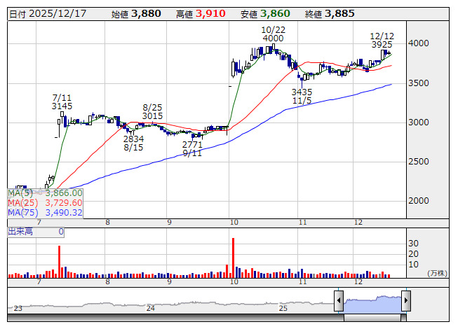 6083>はストップ高買い気配。前日に上半期の決算速報、並びに、26年5月期の業績上方修正を発表している。上半期営業利益は20.8億円で前年同期比3.7倍の水準となったもよう。つれて、通期予想は従来の28億円から45億円、前期比2.2倍に上方修正している。法制度の改正に伴う省エネ・構造関連の審査業務の拡大、及びM&Aによる事業領域の拡大が想定上に順調に進捗しているようだ。年間配当金も従来計画の70円から110円に引き上げ。