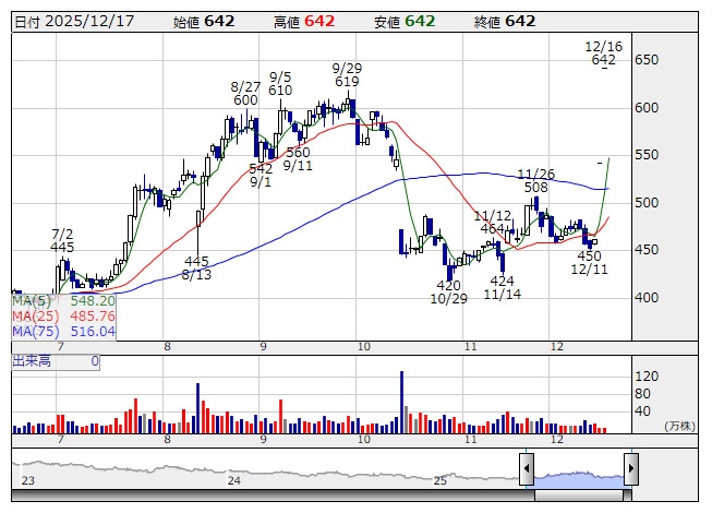 MDV <日足> 「株探」多機能チャートより17日前場 ストップ高: 8銘柄 ストップ安: 0銘柄 (気配、一時を含む)