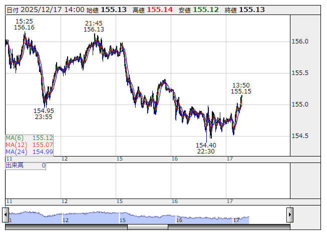 2025年12月17日14時01分 【通貨】外為:1ドル155円13銭前後とドル高・円安で推移 米ドル/円 <5分足> 「株探」多機能チャートより 17日の外国為替市場のドル円相場は午後2時時点で1ドル=155円13銭前後と、前日午後5時時点に比べ25銭のドル高・円安。ユーロ円は1ユーロ=181円97銭前後と6銭の小幅なユーロ安・円高で推移している。 株探ニュース