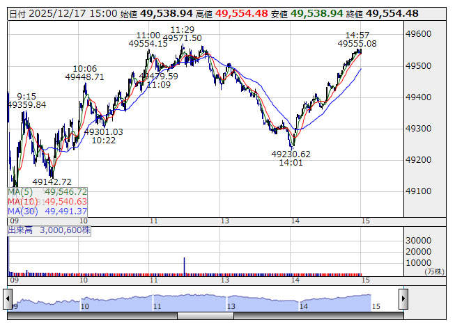 【市況】15時の日経平均は155円高の4万9538円、アドテストが61.50円押し上げ