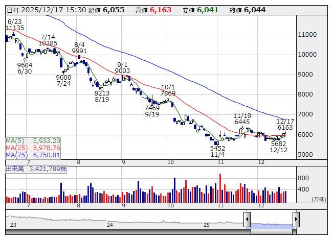 <5838> 楽天銀行 7006 -191 ( -2.7%)