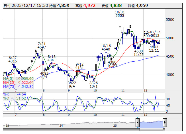 <6501> 日立製作所 4959 +100 ( +2.1%) 4922.6