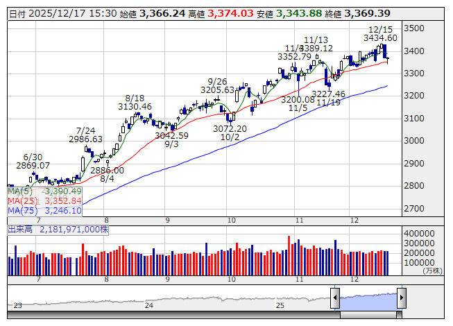2025年12月17日15時47分 【市況】TOPIX先物:17日清算値=7.5ポイント高、3381.5ポイント TOPIX <日足> 「株探」多機能チャートより 17日15時45分、TOPIX先物期近2026年3月限は前日清算値比7.5ポイント高の3381.5ポイントで取引を終えた。出来高は4万2782枚だった。この日のTOPIXの現物終値3369.39ポイントに対しては12.11ポイント高。 株探ニュース