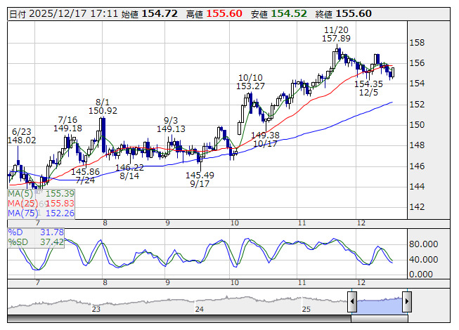 米ドル/円 <日足> Slowストキャス 「株探」多機能チャートより17日の東京市場でドル・円は切り返し。日経平均株価のマイナス転落で円買いに振れると、一時154円51銭まで値を下げた。ただ、日本株が上昇に転じると円売りでドルは持ち直す展開に。夕方は欧州勢のドル買いが強まり、155円58銭まで上値を伸ばした。