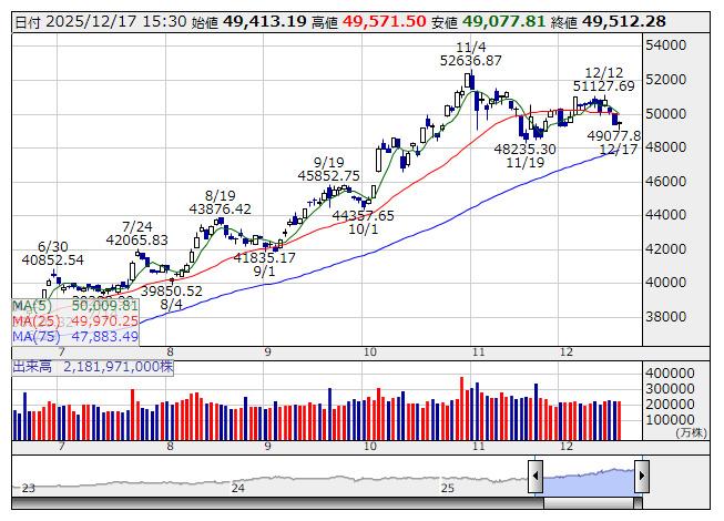 「最近は、グロース市場に特化したような超短期張りのネットトレーダーはおらず、値動きの荒いグロース銘柄に資金を振り向けるタイプの投資家も、プライム市場の大型株との掛け持ちが多い」(ネット証券ストラテジスト)という。つまり、師走相場はプライム市場でキャピタルゲインを確定させる動きが目立つ一方、それと同じ時間軸で含み損のグロース市場銘柄も投げ売りで整理するという動きが例年になく激しいのである。今年後半相場の“隠れテーマ”となっていたプライム市場とグロース市場の二極化が、年末にきて「合わせ切り」というテクニカル的な投資行動を誘発し、結果としてプライム市場もグロース市場も売り圧力に晒されるという羽目に陥っている。当然ながら、ダメージが大きいのはグロース市場ということになる。片や日経平均は前日に25日移動平均線を陰線で下回ったことを話題にする市場関係者が多かったが、これ自体は11月中旬から12月初旬にかけて経験済みで何の希少性もない。むしろ、9月以降3カ月以上にわたって漬物石のようにグロース指数(グロース250指数)の頭を押さえ続けた強靭な25日移動平均線の存在の方が、はるかに話のネタとしてインパクトがある。