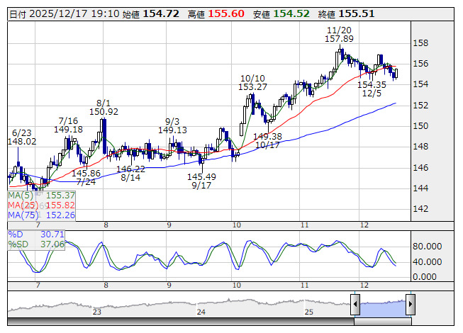 米ドル/円 <日足> Slowストキャス 「株探」多機能チャートより欧州市場でドル・円は下げ渋り、155円59銭から155円42銭まで下落後は底堅さが目立つ。米10年債利回りは失速後に持ち直しており、ドルに買戻しが入りやすい。一方、欧州株と米株式先物の堅調地合いで、株価にらみの円売りが主要通貨を支える。
