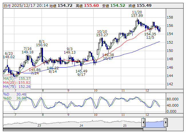 米ドル/円 <日足> Slowストキャス 「株探」多機能チャートより欧州市場でドル・円は155円台半ばでのもみ合いが続き、方向感を欠く展開。米10年債利回りの伸び悩みでドル買いはいったん収束し、ユーロや豪ドルなど主要通貨は対ドルで底堅い。欧米株価指数の堅調地合いを受け、主要通貨は対円でも下げづらい。