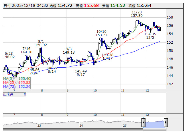 米ドル/円 <日足> 「株探」多機能チャートよりドル・円オプション市場で変動率は連日低下。レンジ相場観測を受けたオプション売りが強まった。リスクリバーサルでは、円コールスプレッドが一段と縮小。円先高観を受けた円コール買いが後退した。