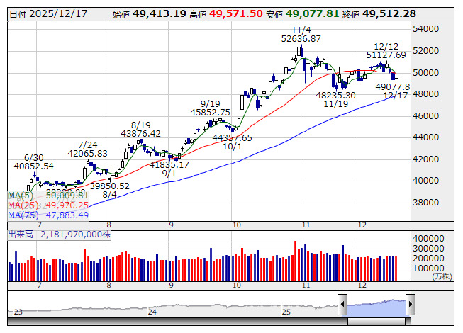 18日の東京株式市場は再びリスク回避ムードが強まり、日経平均株価は大きく下値を探る展開を強いられそうだ。4万9000円台を割り込み11月下旬以来約3週間ぶりに4万8000円後半まで水準を切り下げる可能性がある。前日の欧州株市場は高安まちまちで、欧州主要企業600社で構成されるストックス・ヨーロッパ600指数は前の日の終値とほぼ同じ水準で引けた。しかし、ドイツの主要株価指数であるDAXが続落し約2週間ぶりに2万4000台を下回ったほか、フランスのCAC40なども軟調だった。いずれも米ハイテク株安を横にらみに取引後半に下げ足を強めた。米国株市場ではハイテク株比率の高いナスダック総合株価指数の下げが再び目立っている。AI関連企業の巨額の設備投資に対する警戒ムードが依然として拭えない。この日はオラクル<