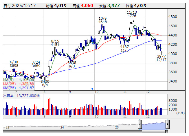 ソニーG <日足> 「株探」多機能チャートより(東証上場 4260 銘柄対象[ETF、REIT含む])