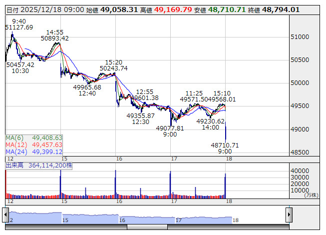 日経平均 <5分足> 「株探」多機能チャートより日経平均は715円安(9時5分現在)。今日の東京株式市場は売りが先行した。昨日の米株式市場で主要指数が下落したことが東京市場の株価の重しとなった。中でも、ハイテク株比率が高いナスダック総合指数が1.81%下落、主要な半導体関連銘柄で構成するフィラデルフィア半導体株指数(SOX指数)が3.78%下落と、ダウ平均(0.47%下落)と比べ下落率が大きく、東京市場でハイテク株や半導体関連株の株価を抑える要因となった。また、今日と明日に開かれる日銀金融政策決定会合の結果を見極めたいとして引き続き積極的な買いを見送る向きもあった。一方、外為市場で1ドル=155円70銭台と、昨日15時30分頃と比べやや円安・ドル高に振れたこが東京市場で安心感となった。また、昨日の日経平均が朝安の後は下げ渋る展開となったことから、相場の下値は堅いとの見方もあったが、寄付き段階では売りが優勢だった。寄り後、日経平均は下げ幅を拡大している。