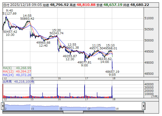 日経平均 <5分足> 「株探」多機能チャートより17日の米株式市場では、NYダウは228ドル安と4日続落。ナスダック総合株価指数は大幅反落し、下落率は1.8%に上った。オラクル<ORCL>のAIデータセンターの建設計画を巡り、一部投資会社が出資交渉から撤退したと伝わり、オラクルの株価が急落。AI関連株への売り圧力が高まり、フィラデルフィア半導体株指数(SOX)は3%を超す下げとなった。朝方の東京市場では米国市場の流れを受けて投資家のリスク許容度が下向き、ハイテク関連株への売りが膨らんでいる。ソフトバンクグループ<9984>はウリ気配スタートとなった。