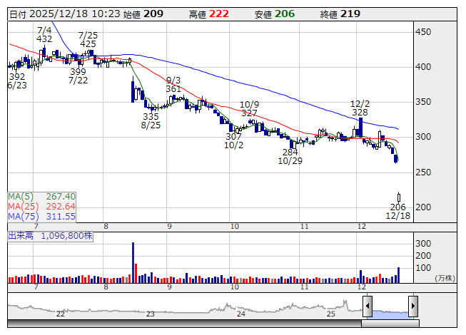 2025年12月18日10時24分 【材料】ペルセウスは急落し上場来安値更新、新株予約権発行し9億3000万円調達へ ペルセウス <日足> 「株探」多機能チャートより ペルセウスプロテオミクス<4882>は急落。上場来安値を更新した。同社は17日の取引終了後、豪マッコーリー・バンクを割当先として第29回新株予約権を発行すると発表。潜在的な希薄化リスクを意識した売りが膨らんだ。ペルセウスは手取り概算で約9億3038万円を調達し、研究開発資金や運転資金に充当する。新株予約権が全て行使された場合、発行済み株式総数を分母とする希薄化率は24.95%となる。 出所:MINKABU PRESS
