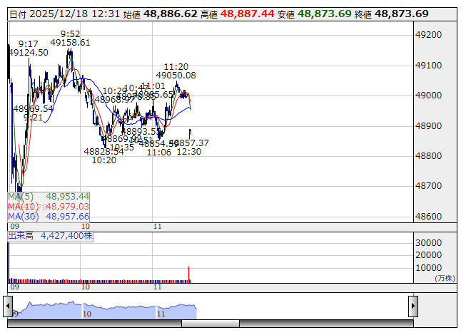 2025年12月18日12時31分 【市況】東京株式(後場寄り付き)=日経平均株価は前場終値比で下げ幅広げる 日経平均 <1分足> 「株探」多機能チャートより 後場寄り付きの東京株式市場では、日経平均株価が前日比620円安前後と前場終値から下げ幅を拡大。外国為替市場では、1ドル=155円70銭台での値動きとなっている。 出所:MINKABU PRESS