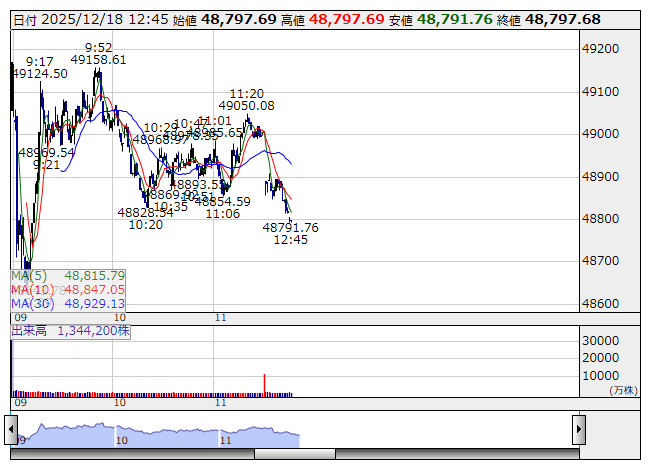 米株式市場の動向を横目に、18日の日経平均は453.97円安の49058.31円と反落して取引を開始した。前場序盤は米国市場でのテクノロジー株安を背景に売りが先行したほか、特に輸出関連株を中心に値を崩す場面がみられた。前場の取引では目立った買い材料に乏しく、日銀の金融政策決定会合を控えた様子見姿勢も散見された。出来高は膨らみ、参加者の間でリスク回避姿勢が強まる中、前場は全般に弱含みとなっている状況が浮かび上がっている。