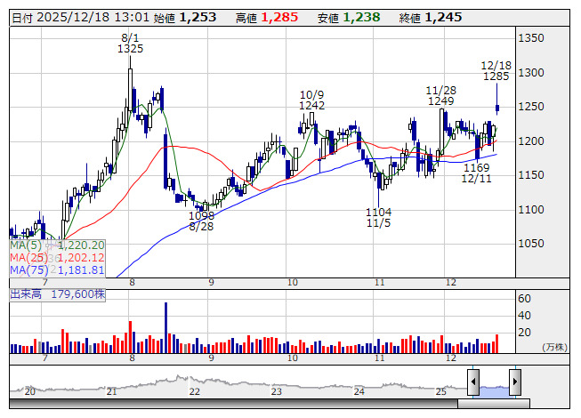 2025年12月18日13時03分 【材料】恵和---続伸、25年12月期の増配を発表 恵和 <日足> 「株探」多機能チャートより 恵和<4251>は続伸。前日に25年12月期の増配を発表している。従来計画の年間35円配当から40円に引き上げ、前期比でも5円の増配となる。DOE4%、配当性向30%を目安とする安定的かつ利益成長に伴う配当の実施に取り組むこととしている中、25年12月期業績の進捗・財政状態などを総合的に勘案した結果としている。前日終値ベースでの配当利回りは3.3%の水準となる。 《HM》 提供:フィスコ