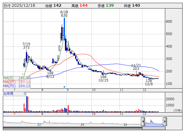 TORICO <日足> 「株探」多機能チャートよりTORICOは大口の買い注文に商いが成立せず、ストップ高水準でカイ気配に張り付いた状態が続いている。17日取引終了後にShooting Star1号投資事業有限責任組合を割当先とする229万8708株の第三者割当増資(発行価格は143円)を実施することを開示。また、同日に新たに暗号資産投資事業の推進を目的とした100%出資子会社設立を決議したことも併せて発表しており、これを手掛かり材料に投資資金が集中する形となっている。株価100円台の低位株で急騰習性を持つことから、個人投資家の短期資金なども誘導されやすい。
