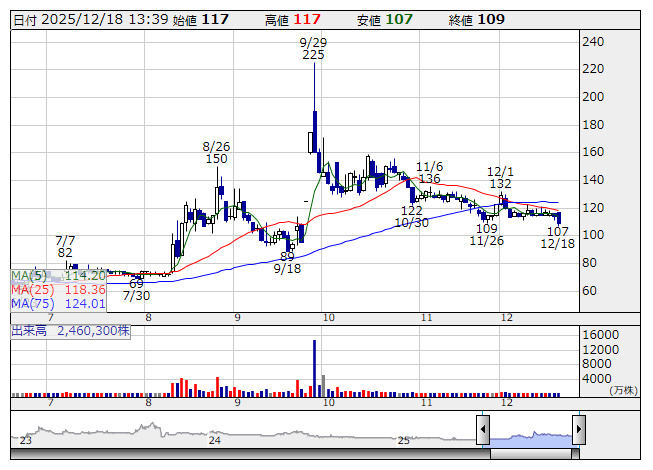 続落。17日の取引終了後に、出願中の「粒子を含む組成物が塗布されたマイクロニードルアレイ」についての日本における特許査定を発表した。同特許は、水に溶けにくい/溶けない物質をばらつきが小さい量で搭載し且つ良好な穿刺性を保つことを可能にするマイクロニードルアレイの製造方法に関するもので、有効期間は2041年迄となっており、日本の他、米国において権利化を目指している。なお、本件が同社グループの2025年12月期業績に与える影響はないとしている。