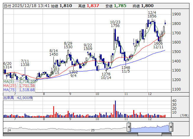 2025年12月18日13時44分 【材料】S&J---続伸、自社株買い実施を発表 S&J <日足> 「株探」多機能チャートより <5599> S&J 1800 +30 続伸。17日の取引終了後に、取得する株式の総数16万株(自己株式を除く発行済株式総数に対する割合2.87%)、取得価額の総額3億円を上限として、自社株買いを実施すると発表し、好材料視されている。取得期間は25年12月18日~26年3月24日。自社株買いを実施する理由は、経営環境の変化に対応した機動的な資本政策を遂行するためとしている。 《HM》 提供:フィスコ