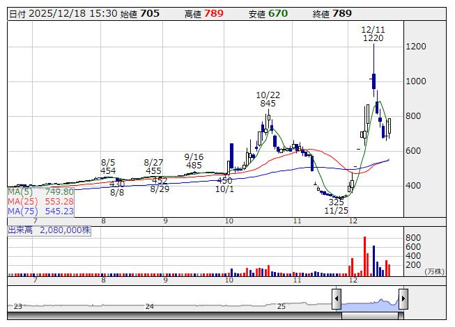 一方、Abalance<3856>がストップ安。出前館<2484>、AIフュージョンキャピタルグループ<254A>、UNIVA・Oakホールディングス<3113>、ANAPホールディングス<3189>、ケイブ<3760>など22銘柄は年初来安値を更新。AIストーム<3719>、ダントーホールディングス<5337>、東京ボード工業<7815>、ひらまつ<2764>、ハピネス・アンド・ディ<3174>は値下がり率上位に売られた。