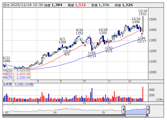 SHIFT<3697>が続急伸。ソフトウェアのテスト受託事業を主力展開するが、金融機関向けなどが好調で業績はトップラインの目覚ましい伸びが続いている。営業利益も24年8月期こそ9%減益と7期ぶりの減益を強いられたとはいえ、ここ10年来高成長路線をひた走る状況だ。26年8月期について売上高は前期比16%増の1500億円見込みと過去最高更新基調に変化はなく、営業利益についても会社側は開示していないものの2ケタの利益成長でピーク利益更新が有力とみられている。しかし、業績好調を極めているにもかかわらず、株価は需給要因から8月中旬を境に一方通行の下落を余儀なくされてきた。今月に入ってからは税負担軽減を狙った損益通算目的の売りが加わり、週明け16日には885円の年初来安値をつけた。しかし、「足もとで損益通算の動きは一巡した気配がある」(ネット証券ストラテジスト)という指摘も出ており、オーバーシュート気味に売られた反動が株価のリバウンドに反映されているもようだ。また、同社株は積み上がった信用買い残がターゲットとなりやすく、貸株市場を経由した空売り攻勢を甘受する傾向が強い。24年の年初から夏場まで8カ月にわたり下げ続けたが、この時も収益面の変調はあったが、仕掛け的な空売りによる影響が大きかったとみられる。今年の夏場以降の下げも同様で、12月は損益通算絡みでダメ押し的な下げに見舞われたが、足もとで機械的な売りは一巡した感触もある。市場では早晩、ショートカバーによる株価浮揚効果を期待する声も聞かれる。